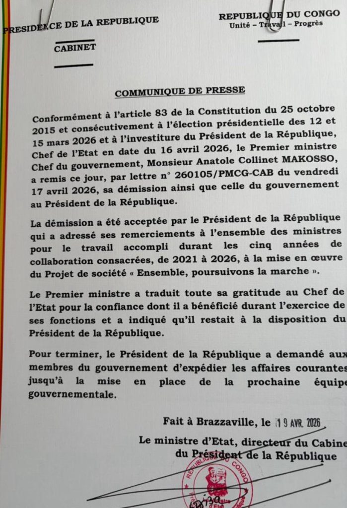 Conformément aux usages républicains et à la suite de la prestation de serment du Président de la République, le Premier ministre Anatole Collinet Makosso a officiellement remis la démission de son gouvernement ce dimanche 19 avril. Cet acte institutionnel, ancré dans le respect des textes fondamentaux, ouvre la voie à la formation d’une nouvelle équipe dédiée à l’accélération du développement national.